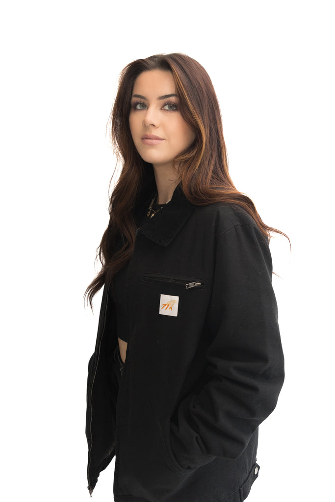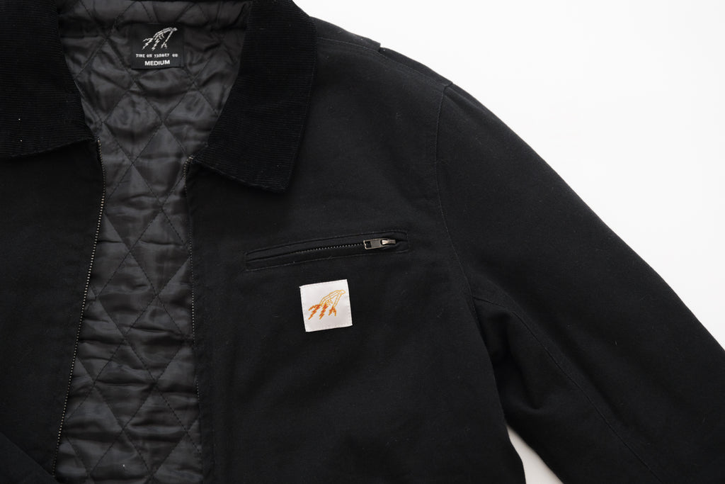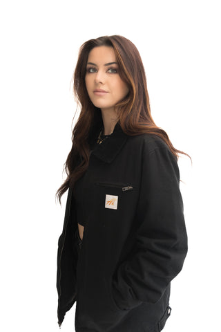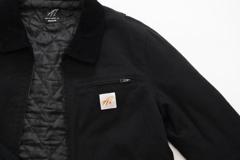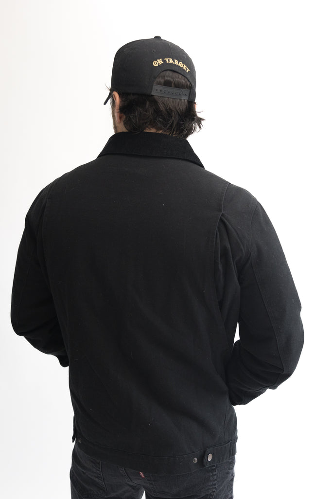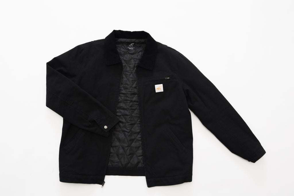 Black Canvas Utility Jacket with gun metal buttons and zippers. Quilted liner with internal pocket as well as a left chest pocket and hand pockets on the front.